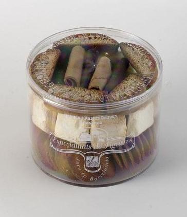 Los botes de surtido variado de 600 grs. son la perfecta mezcla de nuestras mejores galletas artesanas de pasta seca. Una base de teulas, carquinyolis, cubanos grandes, cubanos de chocolate, largas de almendra, una tira de apinyonats de coco y pastas de te, presentadas en estos botes listos para servir en la mesa. Tambiién pueden servir como obsequio.
