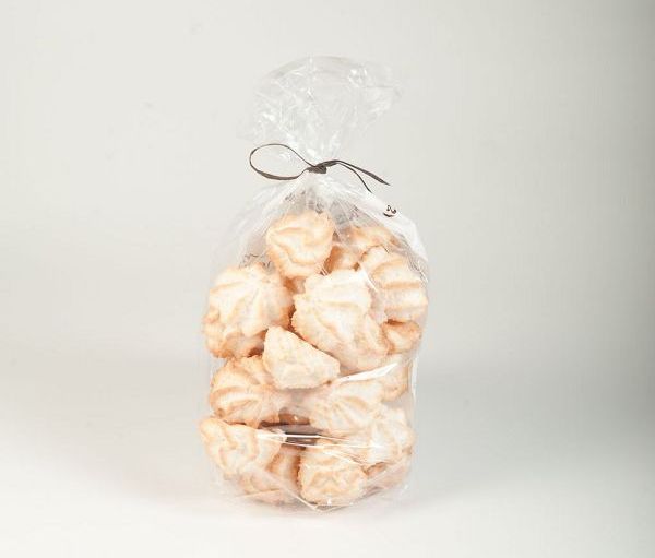 Pieza redonda, hecha artesanalmente, elaborado con coco rallado, azúcar, clara de huevo, i mantequilla. Es muy adecuada para los amantes del coco natural. Las estrías le dan una forma muy peculiar, y son el principal ejemplo de nuestras galletas artesanas y naturales. Imprescindible guardar en lugar fresco!